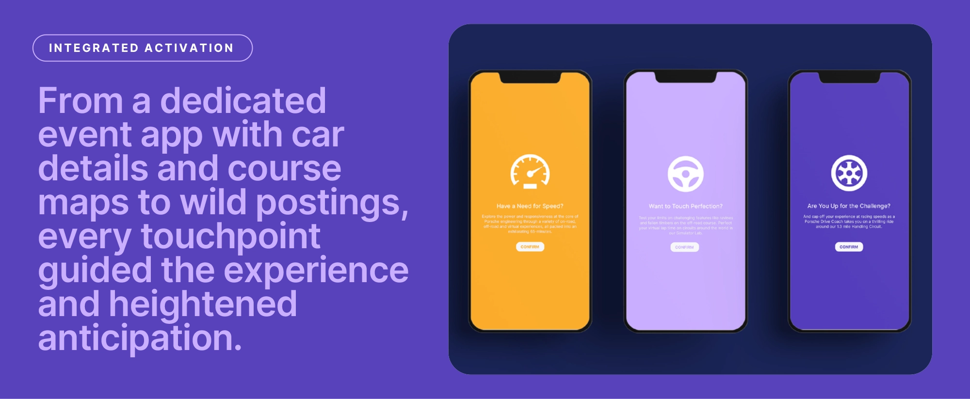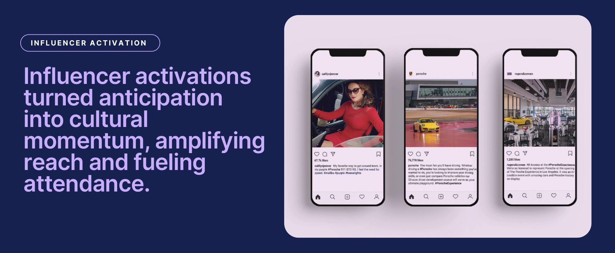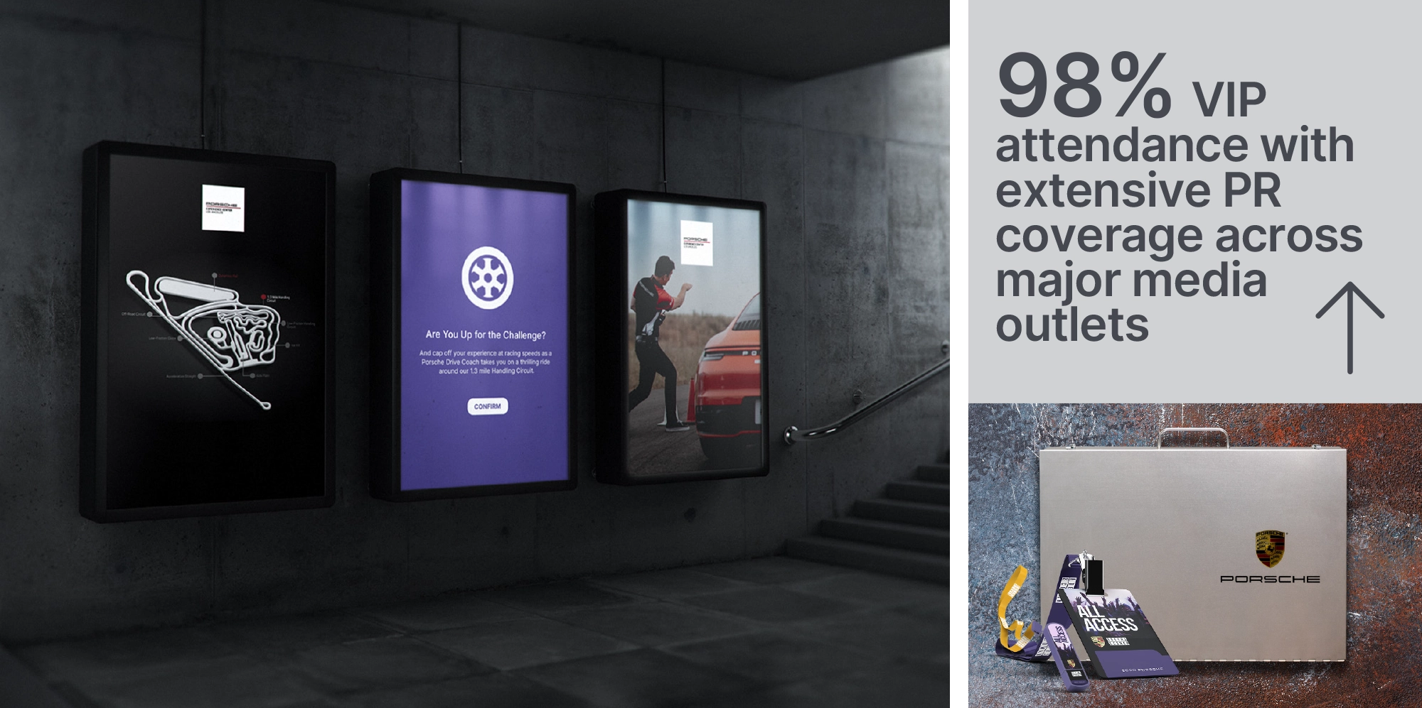 This activation blended physical and digital touchpoints to elevate the Porsche brand experience. From wild postings that built anticipation to tech-enabled access at the track, every detail reinforced Porsche’s commitment to excellence. The result was a launch that reached a younger audience, captured global media attention, and strengthened loyalty by giving VIPs a rare, behind-the-wheel connection with the brand.